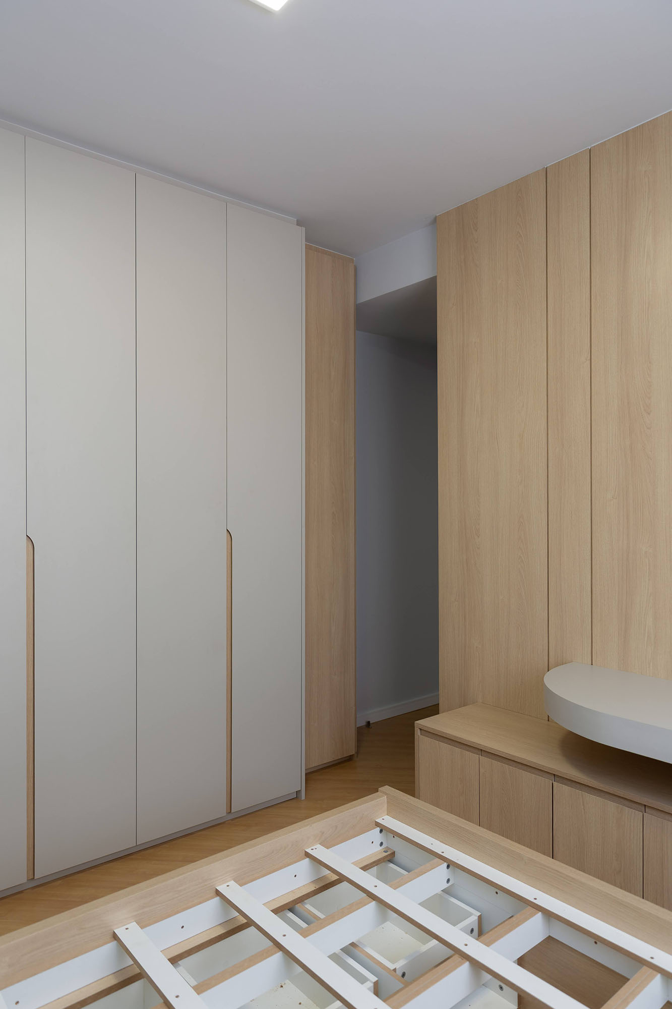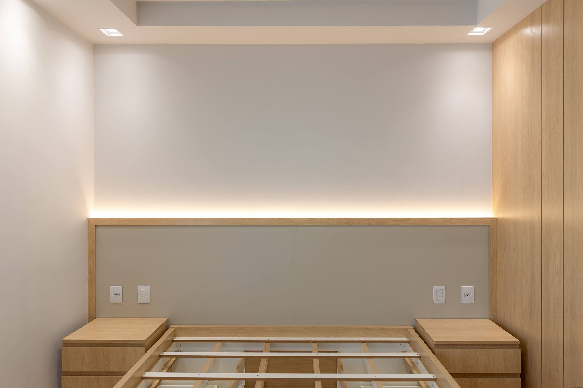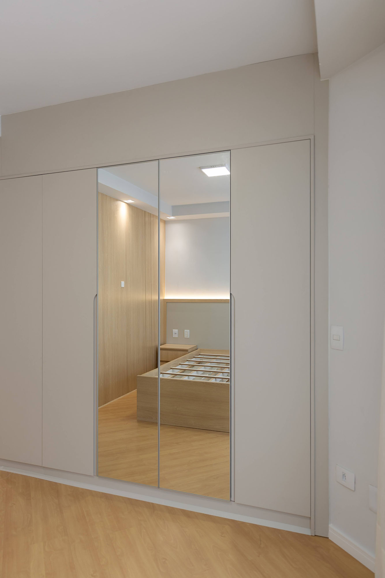 Nos quartos, sendo dois dormitórios de casal e um de solteiro, a marcenaria foi desenvolvida de forma personalizada, priorizando espaços otimizados, funcionalidade e conforto. Cada ambiente recebeu soluções sob medida para armazenamento, organização e proporção adequada, respeitando as necessidades de uso e a identidade do projeto.