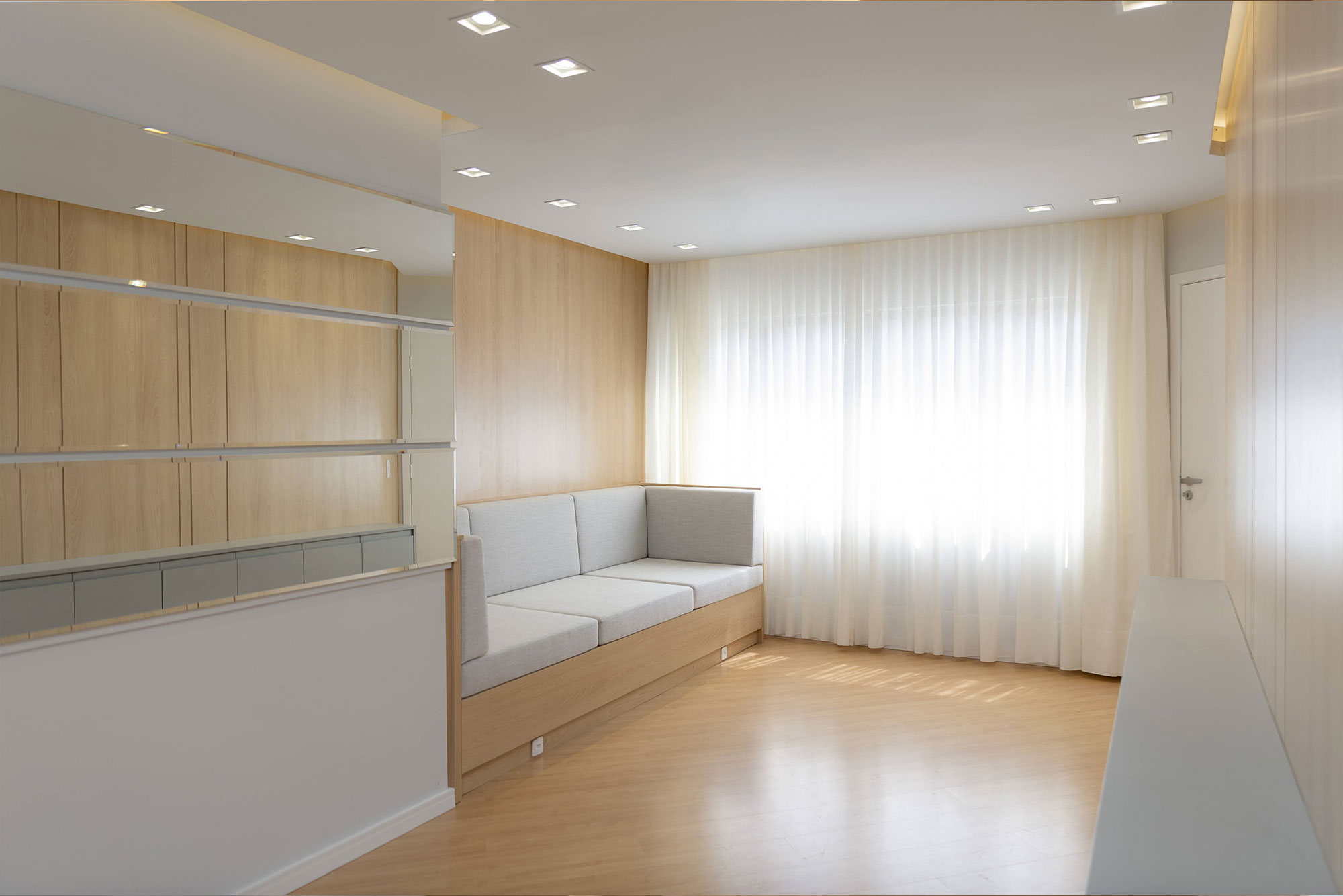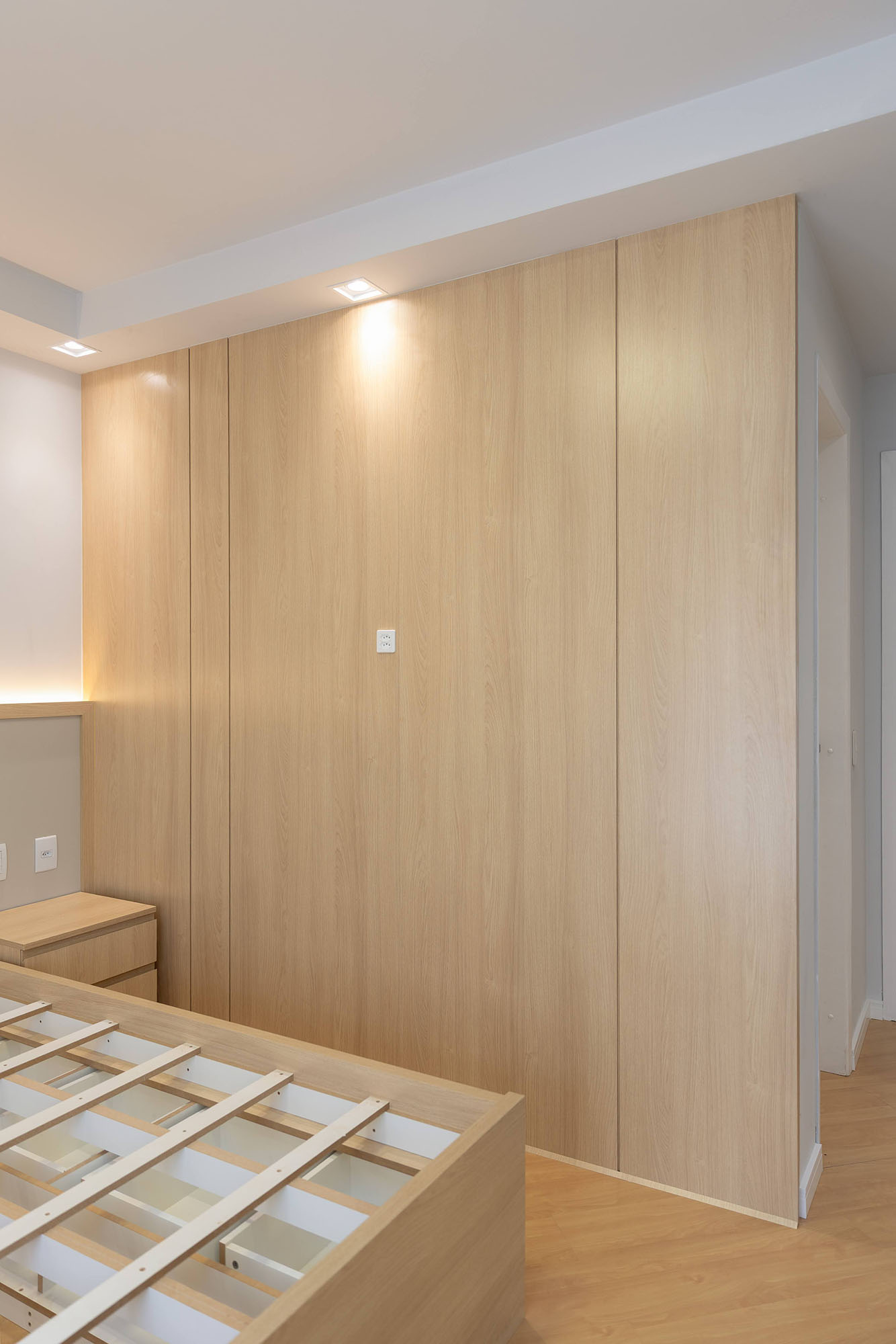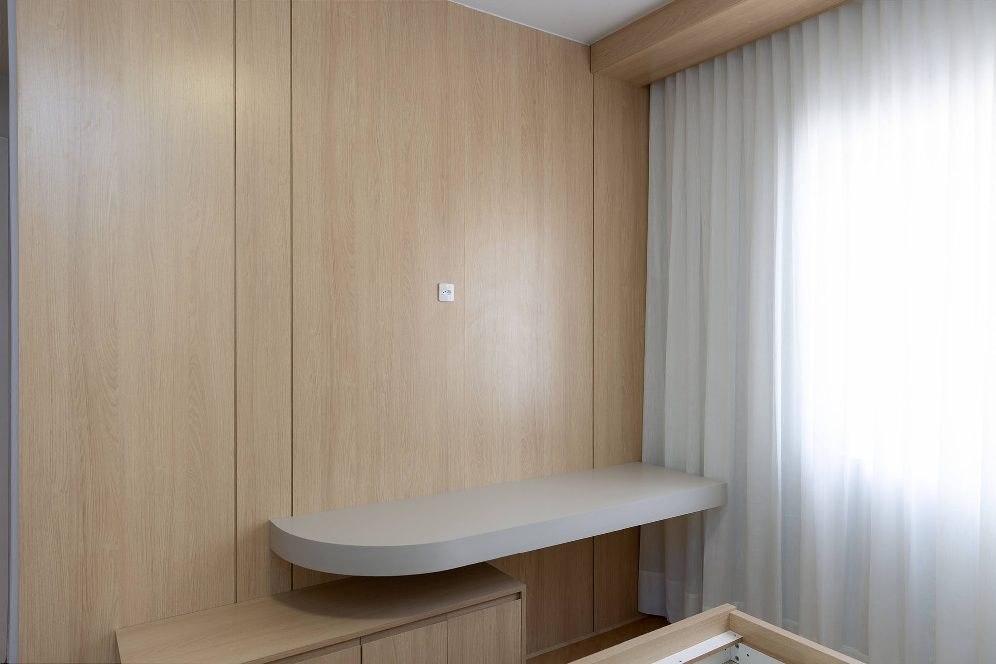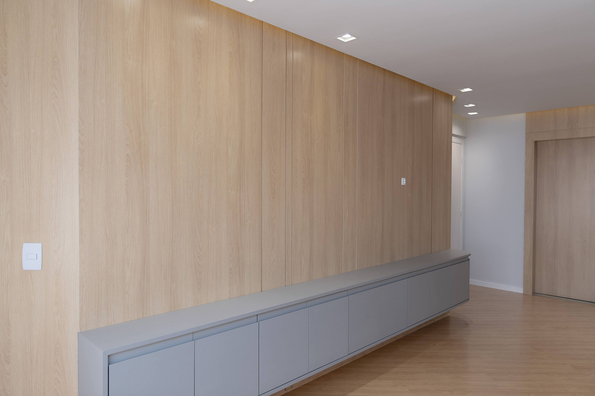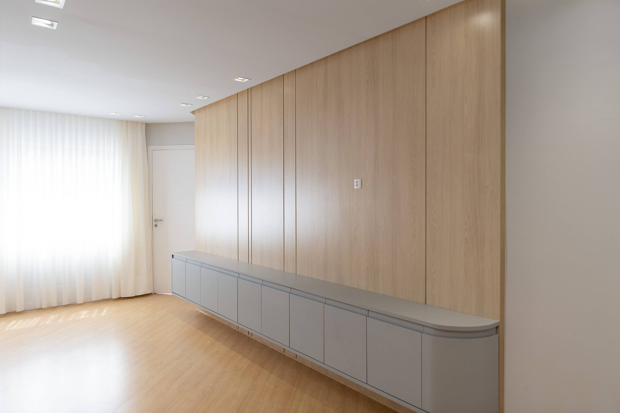 O projeto de móveis sob medida combina o acolhimento do Carvalho Arauco com a elegância do Cinza Guararapes, criando harmonia, equilíbrio visual e sofisticação ao conjunto.