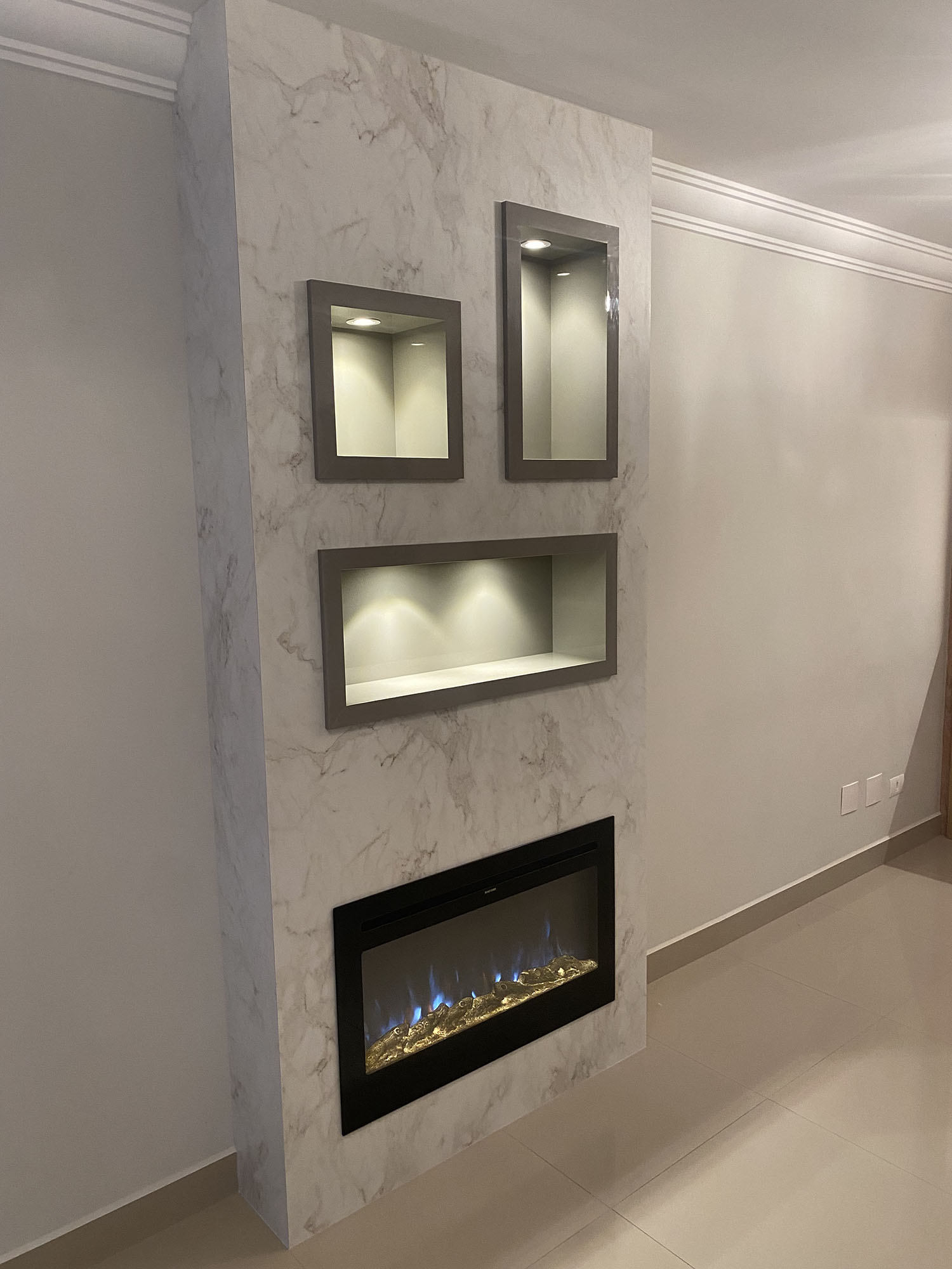 A lareira elétrica Atenna Arauco foi integrada ao mobiliário, criando um ponto focal elegante e funcional, que alia tecnologia, segurança e conforto térmico sem a necessidade de intervenções estruturais.