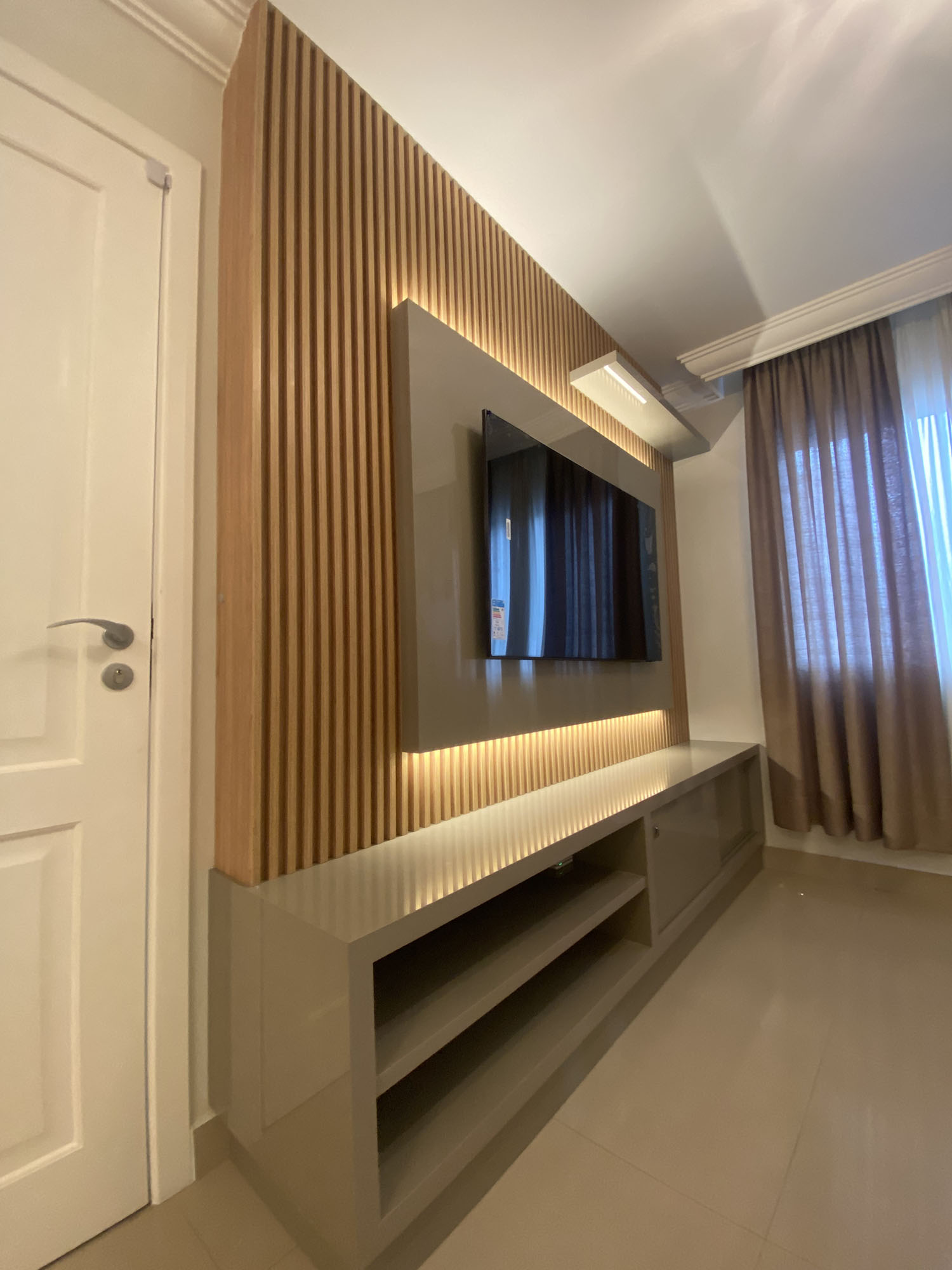 Projeto de sala desenvolvido sob medida, com foco em funcionalidade, estética e integração dos elementos. O ambiente foi planejado para receber balcão buffet, painel com rack integrado e lareira elétrica, garantindo organização, conforto e valorização do espaço.