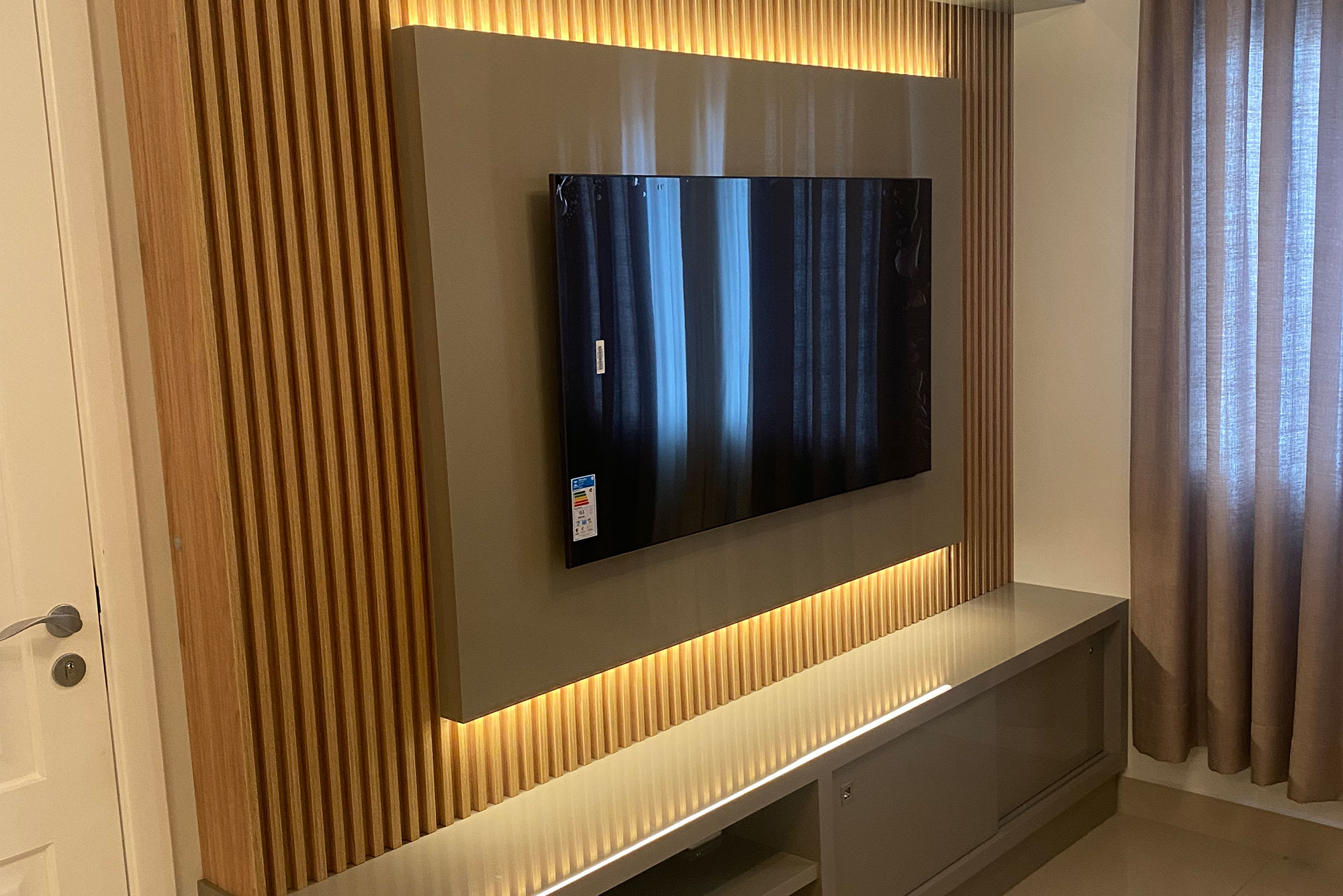 O painel e o balcão buffet em Tauari Guararapes conferem sofisticação, resistência e um acabamento natural ao projeto, além de aquecer visualmente o ambiente. A composição foi pensada para acomodar de forma harmônica os equipamentos eletrônicos, mantendo um visual clean e contemporâneo.